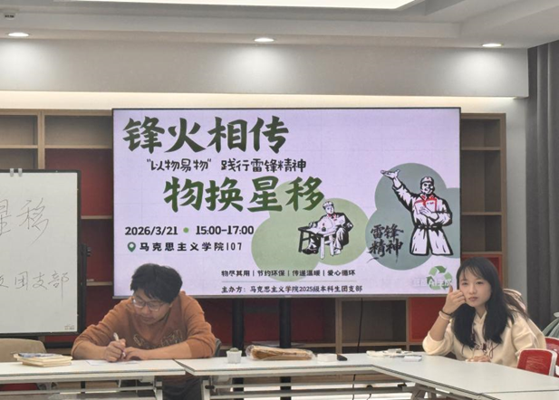 为深入贯彻学雷锋纪念月与青年志愿者服务月工作要求,践行雷锋精神中勤俭节约、互助奉献的核心内涵, 3月21日下午,内蒙古大学马克思主义学院2025级本科生团支部于学院楼107教室成功举办“‘锋’火相传·物换星移”以物易物主题活动。同学们积极响应、踊跃参与,在闲置物品的流转与交换中,让雷锋精神落地生根,以青春实践续写新时代青年的责任与担当。
