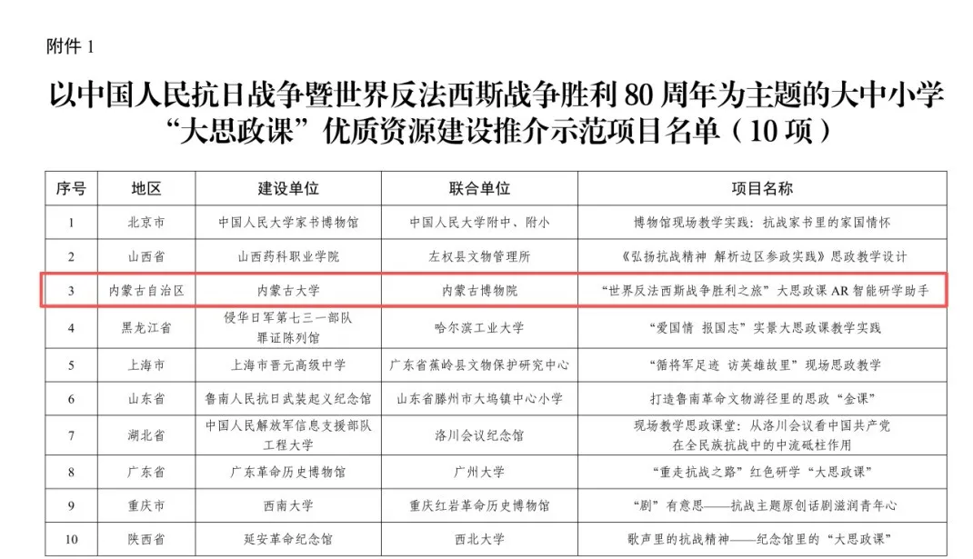 近日,教育部、国家文物局公布以中国人民抗日战争暨世界反法西斯战争胜利80周年为主题的大中小学“大思政课”优质资源建设推介示范项目名单,我校联合内蒙古博物院、海拉尔区人民政府、呼伦贝尔学院马克思主义学院及内蒙古自由极客数字科技有限公司等单位共同打造的“‘世界反法西斯战争胜利之旅’大思政课AR智能研学助手”项目成功入选,全国共立项10项。这是学校持续聚焦红色资源开发、数字赋能思政教育、打造红色文化育人品牌、构建“大思政”育人格局取得的又一项重要成果,我校也成为三次(2023、2024、2026年)获此殊荣的优质资源建设单位。